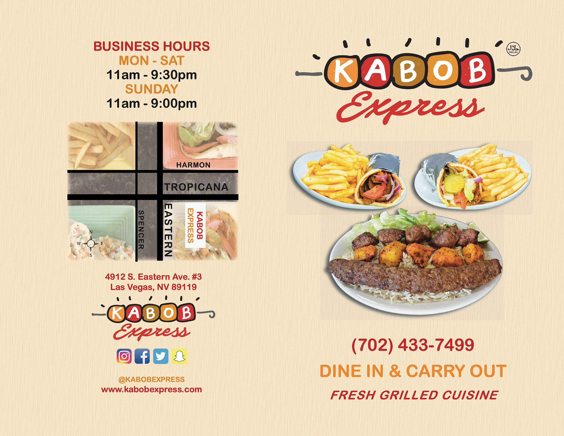 Las Vegas restaurant, Kabob Express LLC. Logo design, menu, business card, promos, photoshoot of products, and social media.